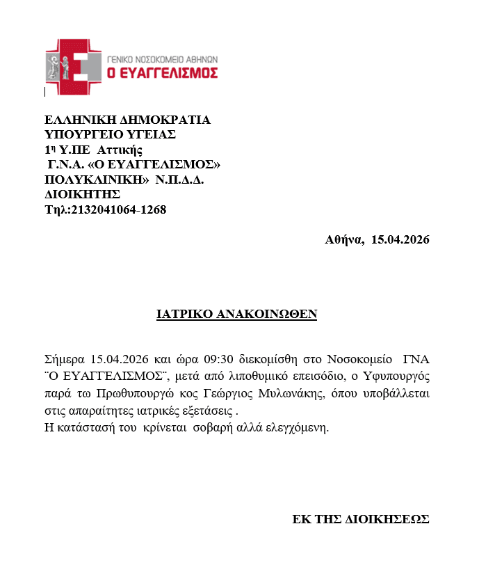 Λιποθύμησε κατά τη διάρκεια της πρωινής σύσκεψης στο Μαξίμου (15.04) ο Γιώργος Μυλωνάκης υφυπουργός παρά τω πρωθυπουργώ (από τον Ιούνιο του 2024) και μεταφέρθηκε με ασθενοφόρο του ΕΚΑΒ στον Ευαγγελισμό.