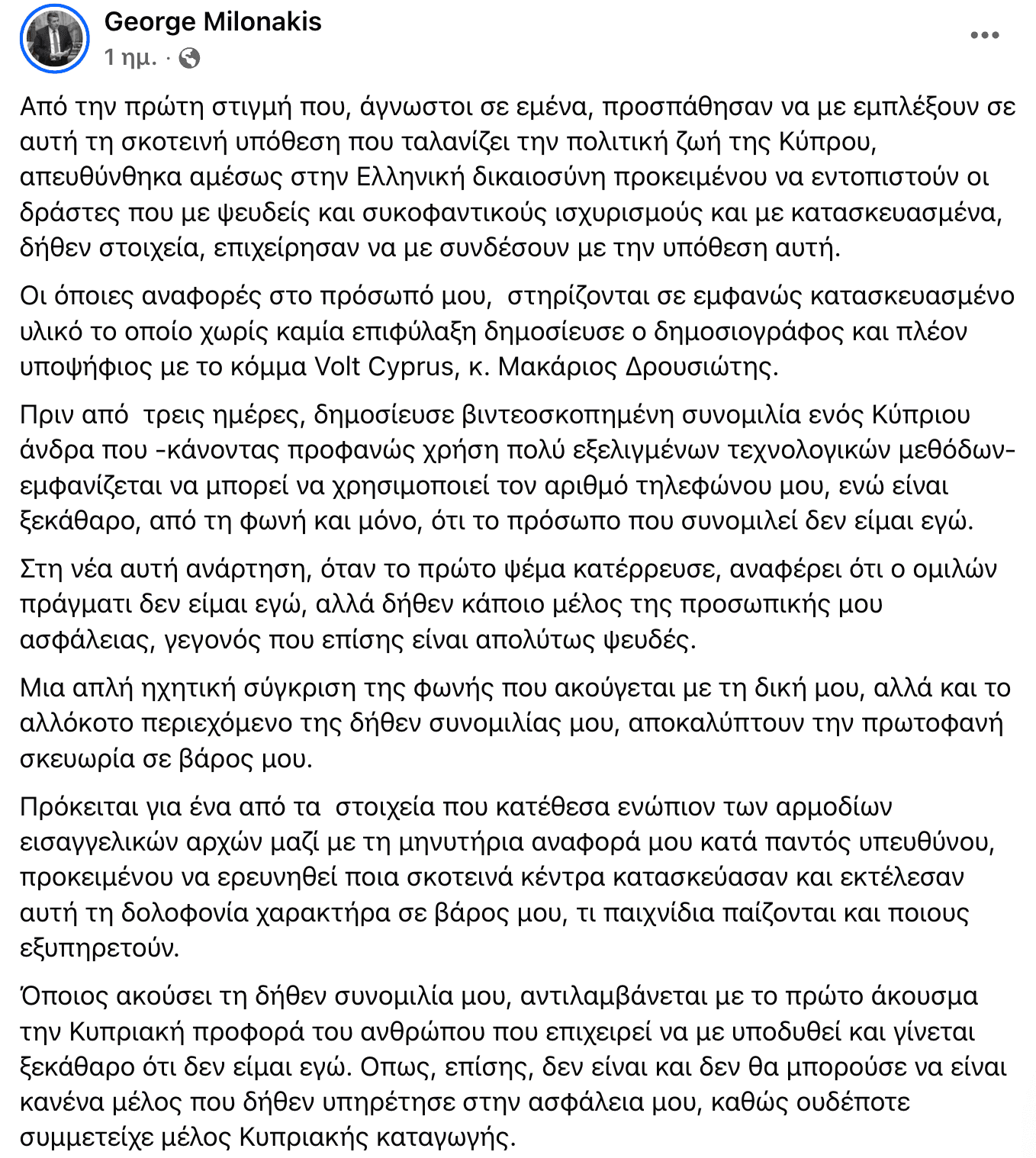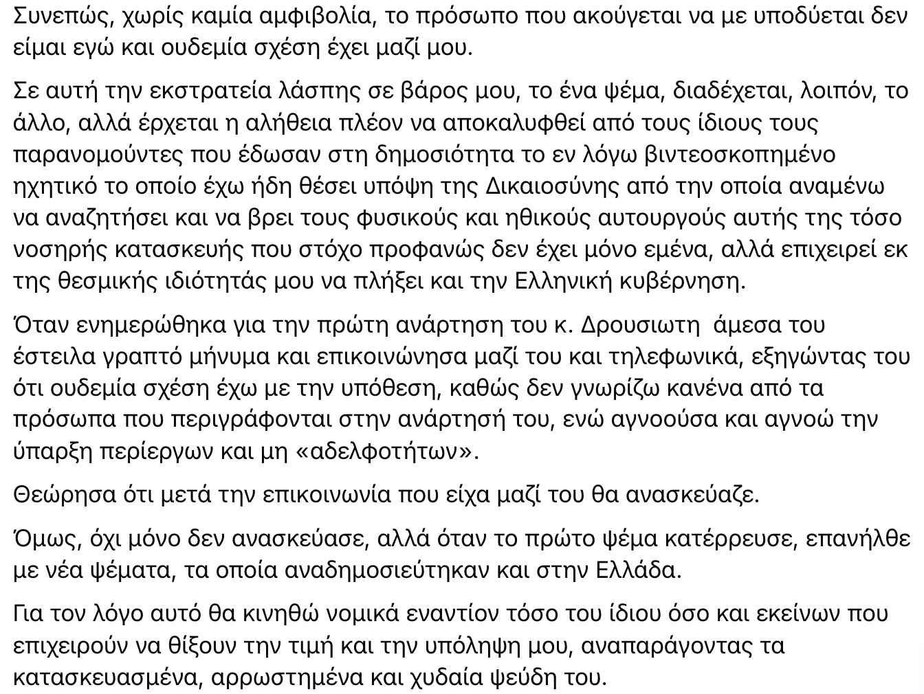 * O Γιώργος Μυλωνάκης με ανάρτησή του στα μέσα κοινωνικής δικτύωσης την Τρίτη είχε γνωστοποιήσει ότι θα κινηθεί νομικά κατά του Κύπριου δημοσιογράφου Μακάριου Δρουσιώτη και όσων αναπαράγουν συγκεκριμένους ισχυρισμούς εναντίον του.